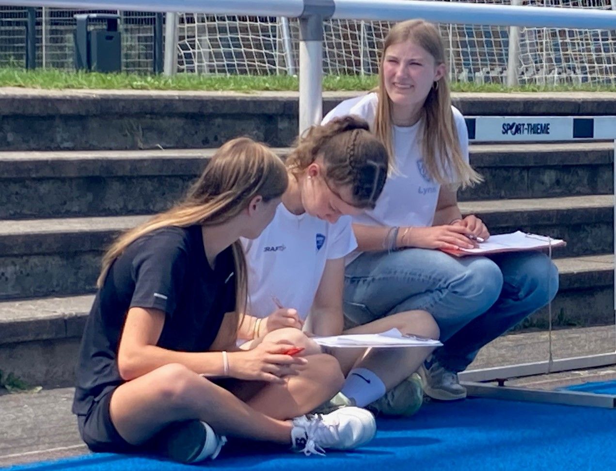 In 13 Teams nehmen an zwei Tagen insgesamt ungefähr 300 Kinder jeweils an einem Dreikampf teil, den Olympischen HöVi-Spielen. TuS-Leichtathletikchefin Uschi Heimann wärmt die Nordlichter auf, dann geht’s an die Stationen Heuler-Weitwurf („wow, die kann man ja richtig hören!“, kommentiert ein Kind staunend den Wurf eines Gruppenkollegen), Weitsprung („Brandon, das war ein Riesensatz!“) und 30 Meter fliegend. Statt aus dem Startblock starten die Läuferinnen und Läufer an einer Ablaufmarkierung, rennen so schnell sie können durch zwei Lichtschranken, die die Zeitmessung auslösen. Sprint-Sprung-Trainer Dieter Dylong hat die Lichtschranken dafür extra niedriger als sonst üblich gebaut, damit auch die jüngsten Starterinnen und Starter selbst die Zeit auslösen können. Und der Lauf über die 30 Meter bereitet den meisten so viel Spaß, dass viele HöVi-Betreuerinnen und Betreuer fragen, ob sie auch mal rennen dürfen. Klar dürfen sie. Und werden prompt von ihren Schützlingen so laut angefeuert, wie sie das umgekehrt vorher auch schon hatten. Wenn das mal keine gelebte Hygge ist.