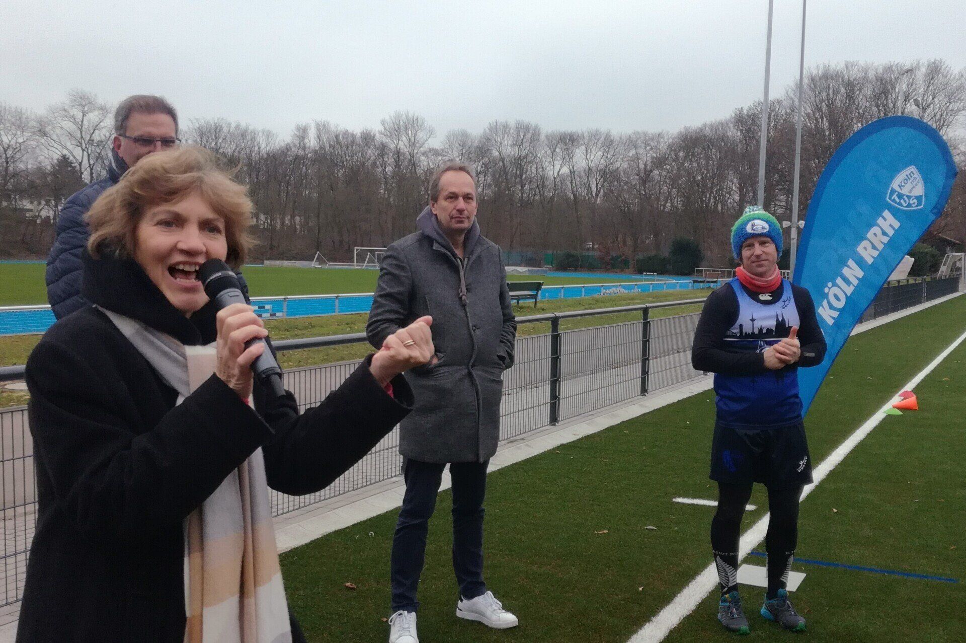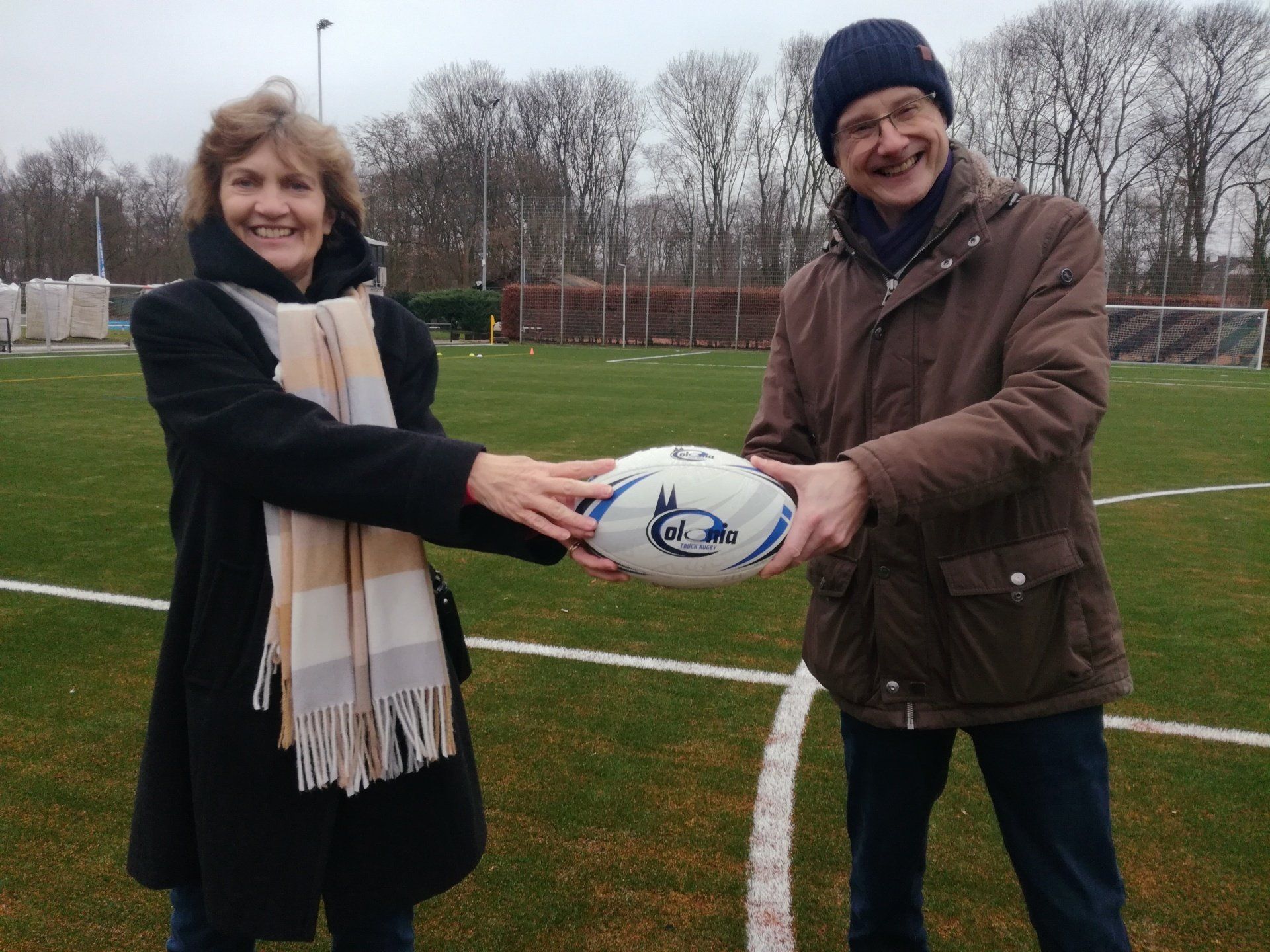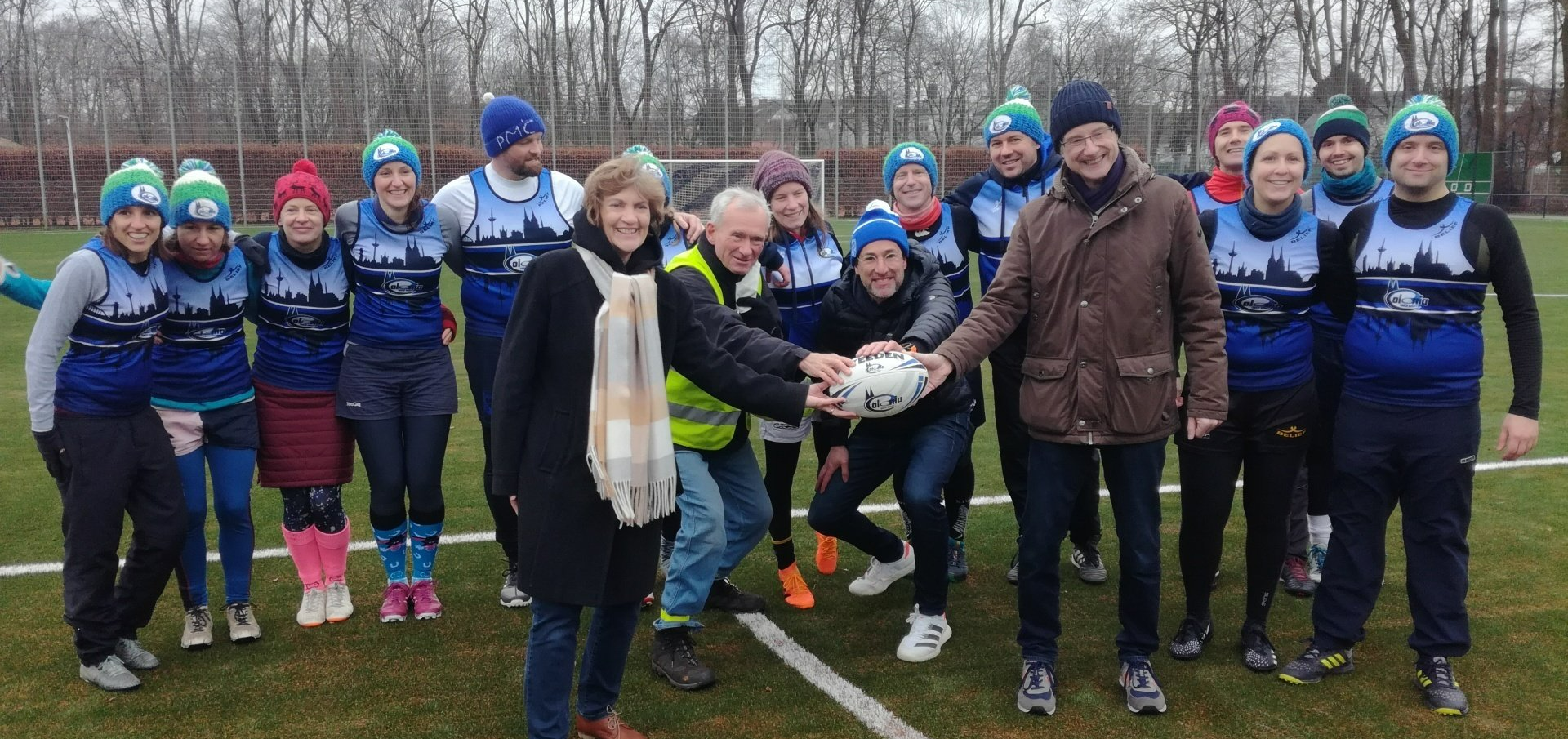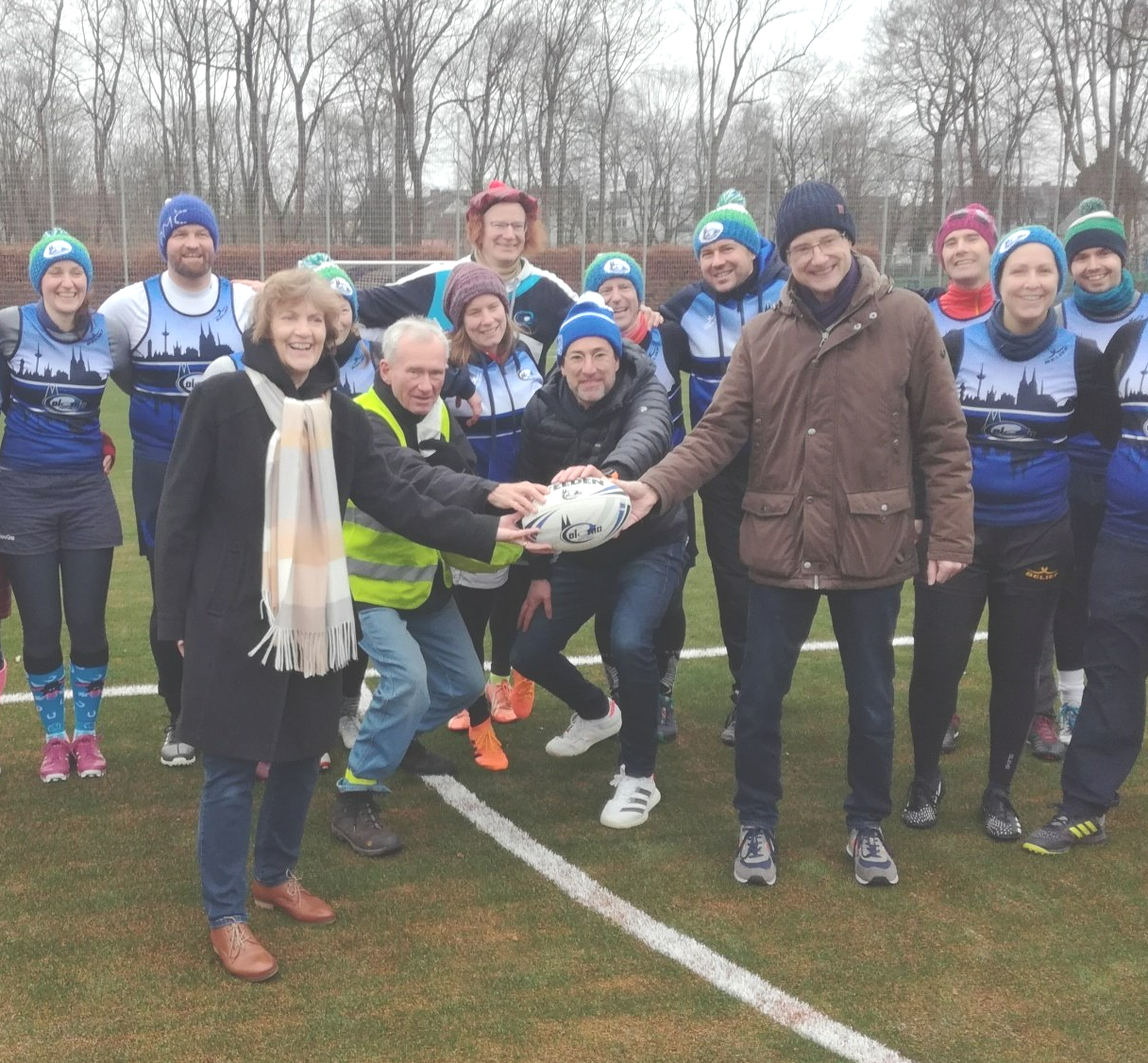 15.01. Viele Jahre haben vor allem unser Sparten Fußball und Touch Rugby geträumt (und gespart). Ein halbes Jahr wurde gebaut. Nun konnte er sich feiern lassen - unser neuer Kunstrasen! In einem kleinen Festakt im Beisein von Bezirksbürgermeisterin Frau Greven Thürmer, Pfarrer Meurer, Herrn Timmer, Leiter des Sportamtes der Stadt Köln, unserem Landschaftsarchitekten Herrn Schulze und dem Chef unseres Bauunternehmens Ralph Krämer wurde der Kunstrasen offiziell seiner Bestimmung übergeben. Den sportlichen Rahmen bot unsere Touch Rugby Abteilung. Schon traditionell tragen sie im Januar den Pudelmützen-Cup aus. Teams von München bis Hamburg waren auch diesmal angereist und boten einen würdigen Rahmen für die kleine Feier. In einer kurzen Ansprache griff unser 1. Vorsitzender Robert Krämer in die Erinnerungskiste und las in Teilen dem Sportamtsleiter Herrn Timmer einen Brief vor, den dieser uns 2019 geschrieben hatte: "Der TuS Köln rrh. ist nicht aufgenommen in der Liste der Vereine, für die die Stadt einen Kunstrasen baut" - soweit damals die schlechte Nachricht. Die gute folgte ein paar Zeilen später: "Es stehen Gelder zur Verfügung, um Projekte mit 87,5 % zu fördern". Im Klartext: Bringt ihr 12,5 % der ca. 686.000 € auf, dann zahlt die Stadt die 87,5 % für euren Traum. "Letztlich alle Mitglieder im Verein gemeinsam und die Fußballer mit einem Löwenanteil von 60 % - unterstützt von großzügigen Spenden - machten die Umsetzung möglich", brachte Robert die doch durchaus auch anstrengende Zeit der vereinsinternen Diskussion, der Sponsorensuche der Fußballer und die Zeit des Sparens auf den wesentlichen Punkt. Unter großem Gelächter zeigte er dann ein Bild einer TuS Herren-Mannschaft von 1923. Jetzt sind auf der Platzanlage nicht nur die Zeiten von ernsten Sportlern in bis zum Bauchnabel hochgezogenen Sporthosen vorbei, sondern auch die Zeiten von Matsch im Winter und Staubwolken im Sommer. Sehr ehrlich gemeinte Worte des Dankes gingen an die Vertreter der Stadt Köln und an Pfarrer Meurer als größten Spendengeber. Uns allen ist klar, dass ohne diese Unterstützung sich unser Tennenplatz nie in einen Kunstrasen verwandelt hätte. Sehr sympathische Worte fanden dann Frau Greven Thürmer und Herr Timmer für unseren Verein und unser Engagement im Veedel und im Sport.