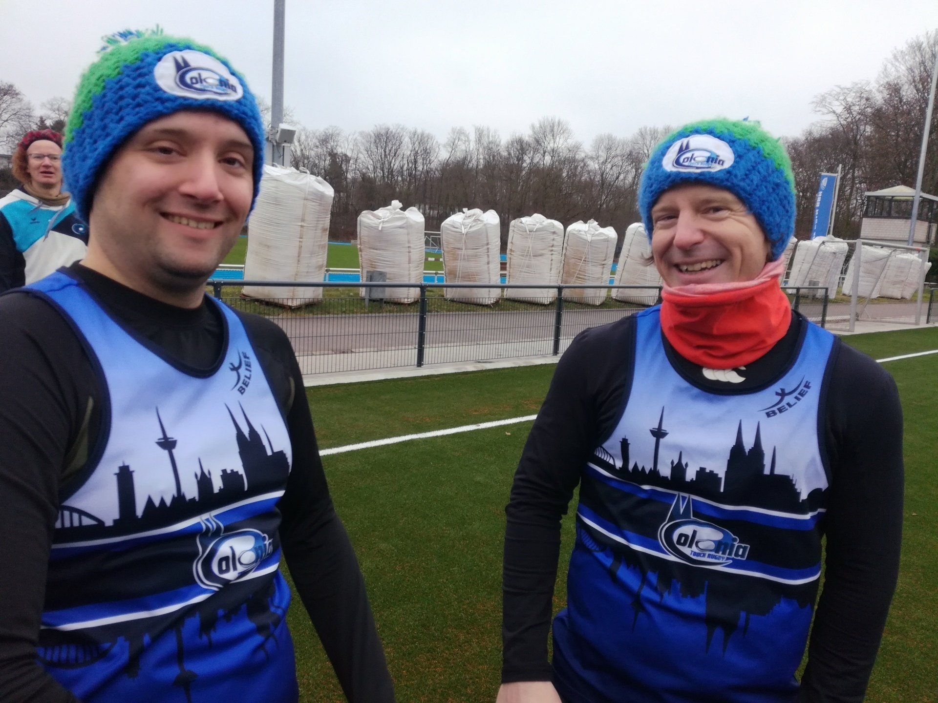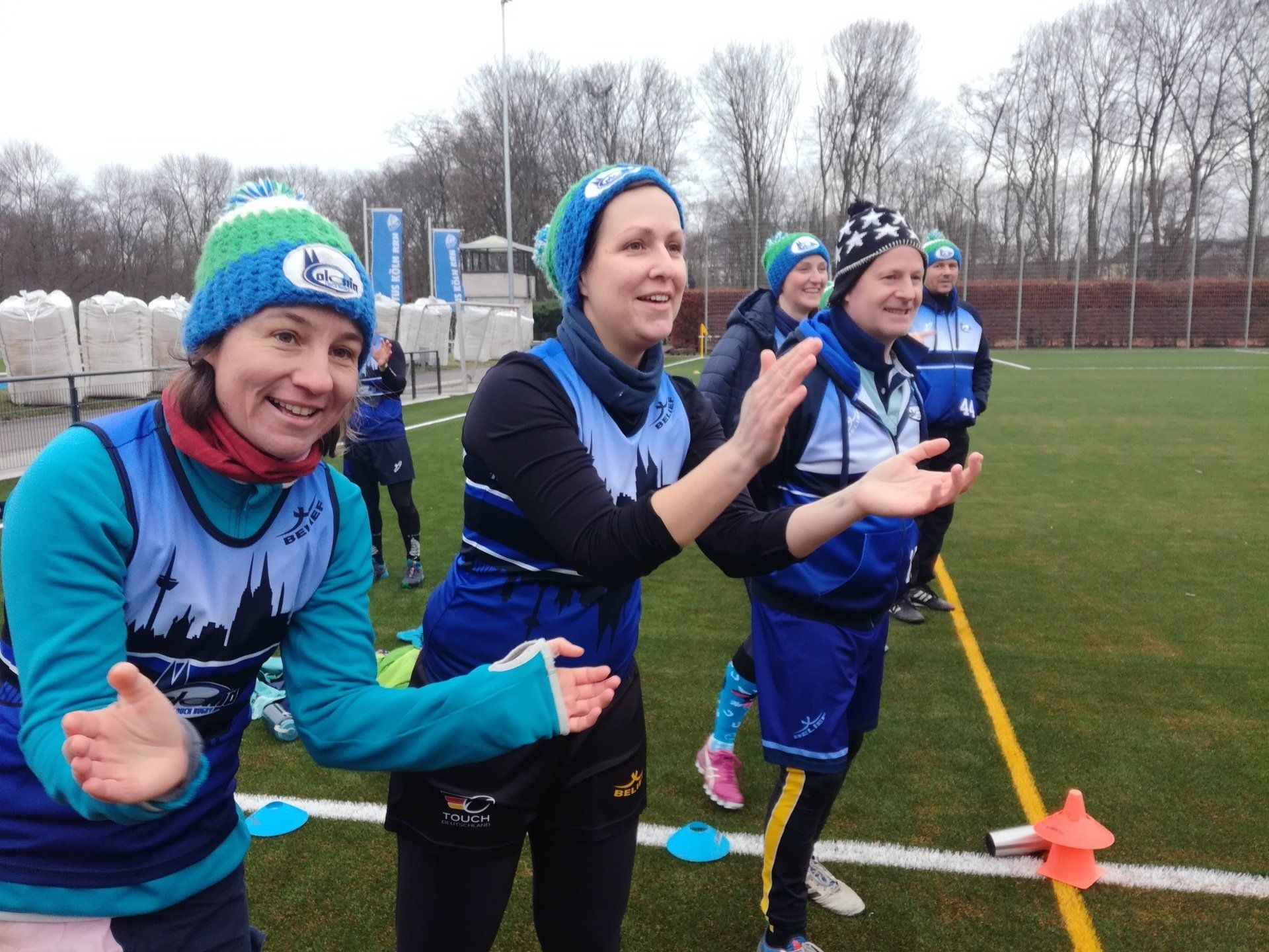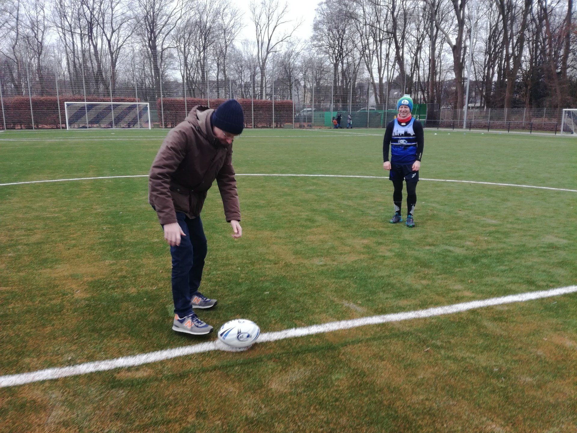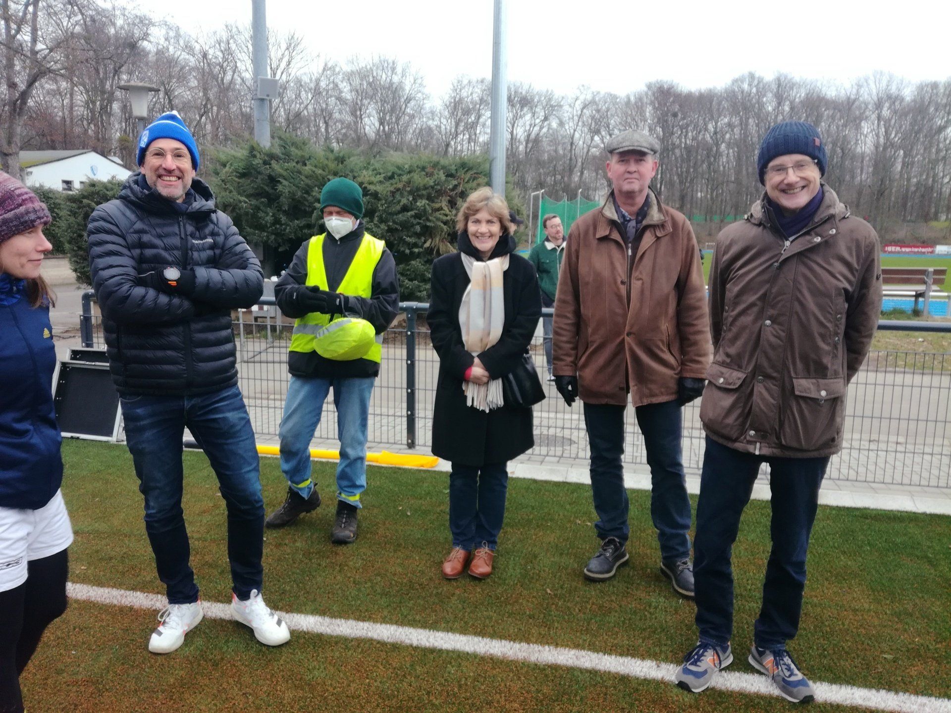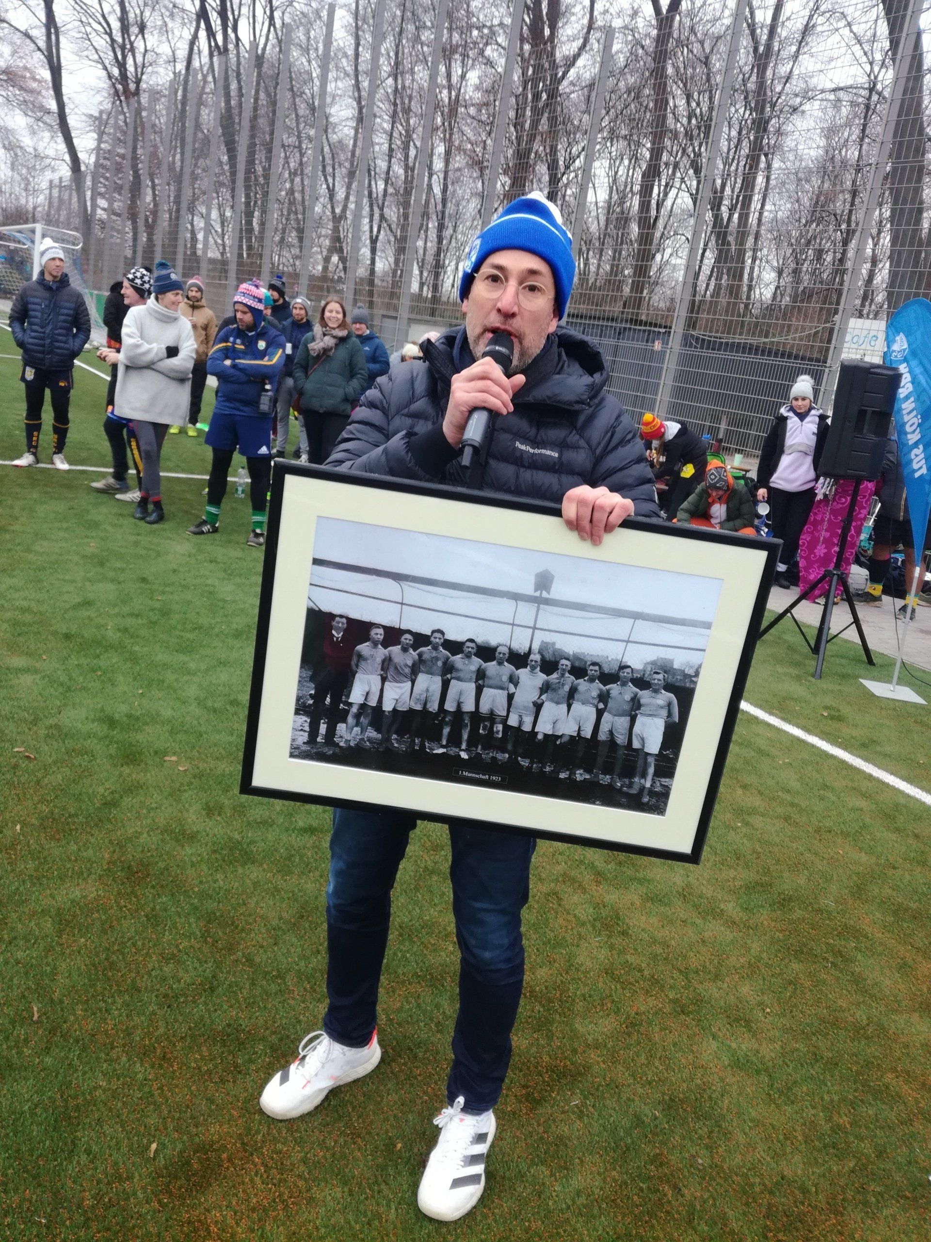 15.01. Viele Jahre haben vor allem unser Sparten Fußball und Touch Rugby geträumt (und gespart). Ein halbes Jahr wurde gebaut. Nun konnte er sich feiern lassen - unser neuer Kunstrasen! In einem kleinen Festakt im Beisein von Bezirksbürgermeisterin Frau Greven Thürmer, Pfarrer Meurer, Herrn Timmer, Leiter des Sportamtes der Stadt Köln, unserem Landschaftsarchitekten Herrn Schulze und dem Chef unseres Bauunternehmens Ralph Krämer wurde der Kunstrasen offiziell seiner Bestimmung übergeben. Den sportlichen Rahmen bot unsere Touch Rugby Abteilung. Schon traditionell tragen sie im Januar den Pudelmützen-Cup aus. Teams von München bis Hamburg waren auch diesmal angereist und boten einen würdigen Rahmen für die kleine Feier. In einer kurzen Ansprache griff unser 1. Vorsitzender Robert Krämer in die Erinnerungskiste und las in Teilen dem Sportamtsleiter Herrn Timmer einen Brief vor, den dieser uns 2019 geschrieben hatte: "Der TuS Köln rrh. ist nicht aufgenommen in der Liste der Vereine, für die die Stadt einen Kunstrasen baut" - soweit damals die schlechte Nachricht. Die gute folgte ein paar Zeilen später: "Es stehen Gelder zur Verfügung, um Projekte mit 87,5 % zu fördern". Im Klartext: Bringt ihr 12,5 % der ca. 686.000 € auf, dann zahlt die Stadt die 87,5 % für euren Traum. "Letztlich alle Mitglieder im Verein gemeinsam und die Fußballer mit einem Löwenanteil von 60 % - unterstützt von großzügigen Spenden - machten die Umsetzung möglich", brachte Robert die doch durchaus auch anstrengende Zeit der vereinsinternen Diskussion, der Sponsorensuche der Fußballer und die Zeit des Sparens auf den wesentlichen Punkt. Unter großem Gelächter zeigte er dann ein Bild einer TuS Herren-Mannschaft von 1923. Jetzt sind auf der Platzanlage nicht nur die Zeiten von ernsten Sportlern in bis zum Bauchnabel hochgezogenen Sporthosen vorbei, sondern auch die Zeiten von Matsch im Winter und Staubwolken im Sommer. Sehr ehrlich gemeinte Worte des Dankes gingen an die Vertreter der Stadt Köln und an Pfarrer Meurer als größten Spendengeber. Uns allen ist klar, dass ohne diese Unterstützung sich unser Tennenplatz nie in einen Kunstrasen verwandelt hätte. Sehr sympathische Worte fanden dann Frau Greven Thürmer und Herr Timmer für unseren Verein und unser Engagement im Veedel und im Sport.