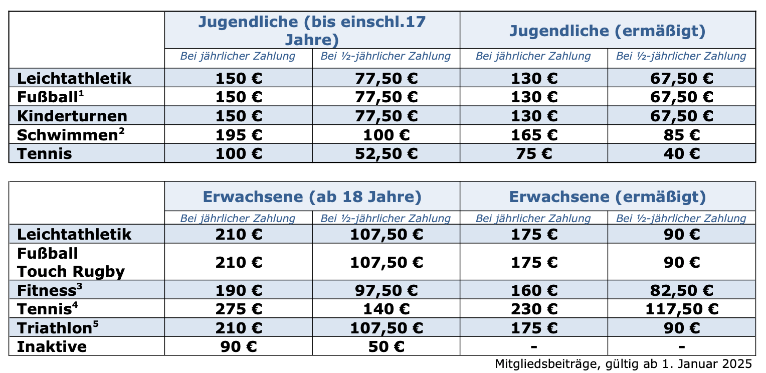 Der Mitgliedsbeitrag richtet sich nach der teuersten Sportart. Weitere Nutzungen sind im Beitrag enthalten.