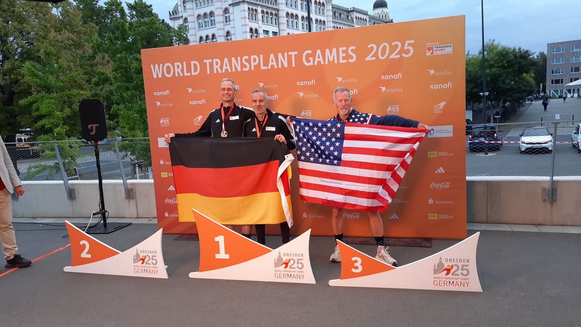 23./24.08., Dresden. GOLD über 400m, GOLD im Speerwurf, GOLD über 800m, GOLD im Diskus ... und nebenbei eine Weltbestleistung! Die World Transplant Games 2025 in Dresden sind nicht die ersten Weltspiele für Nehar Nurlu, aber nun seine erfolgreichsten. 2005 in Kanada war er das erste Mal dabei, seitdem regelmäßig: 2007 in Thailand, 2009 in Australien, 2011 in Schweden, 2013 in Südafrika, 2015 in Argentinien, 2017 in Spanien, 2019 in England und nun 2025 in Deutschland. Sieben Goldmedaillen, neun silberne und vier bronzene hat Nehar in den Disziplinen 400, 800, 1500, 5km Straßenlauf und Diskus seitdem gesammelt. Seine bisher erfolgreichsten Spiele waren die in Argentinien 2015 mit drei goldenen Medaillen und dem Weltrekord über 400m in seiner Altersklasse der 50 – 59 jährigen. Mittlerweile ist Nehar fast 61 und jagt eine Klasse höher die Bestleistungen, die weltweit ein Transplantierter je erzielt hat. Am ersten Wettkampftag in Dresden war er über 400m mit 66,52 sec und fast vier Sekunden Vorsprung vor dem Zweitplatzierten Hector Calleros aus Mexiko (70,39 sec) schon knapp dran. Ein paar Stunden später fiel die Weltbestmarke dann im Speerwurf - und damit in der Disziplin, die Nehar neu in sein Wettkampfprogramm aufgenommen hat. Der Rekord steht seit dem 22.08.2025 nun bei 35,06m und gehört Nehar! Und damit nicht genug, Nehars Wettkampfprogramm ging weiter. Am Vormittag des zweiten Tages brillierte er im Diskuswurf und gewann mit 35,38 m (Weltbestleistung 35,51m) und 2,57m Vorsprung sein drittes Gold. Zum Abschluss ging es dann - keine 24h nach dem kräftezehrenden 400m-Rennen - noch einmal an die Startlinie, diesmal über die doppelte Distanz und u. a. wieder in Konkurrenz mit dem Mexikaner Hector Calleros, der das Rennen diesmal spannender gestalten konnte als noch am Vortag über die 400m. In 3:11,11 min rettete Nehar 64 Hundertstel Vorsprung ins Ziel. Damit blieb die Farbe seiner Medaillen zwar einseitig, aber absolut beeindruckend: Viermal Gold! Für diese dann doch außergewöhnliche Leistung wurde Nehar am Ende der beiden Leichtathletiktage dann auch besonders ausgezeichnet.