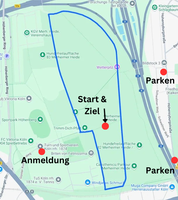Der 5km- und 10km-Lauf starten zeitgleich auf dem Weg zwischen Trimm-Dich-Pfad und den Tischtennisplatten auf der Merheimer Heide.
