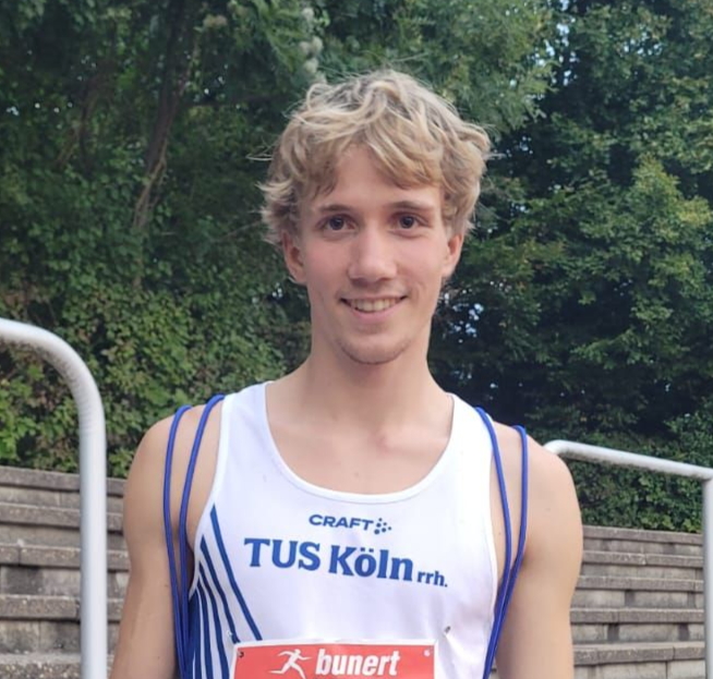 Über dieselbe Strecke wie Mara waren in Bergisch Gladbach auch Jan und Finn Merheim auf der Jagd nach persönlichen Rekorden. Zur Renntaktik für das 1500m Rennen der zwei hatten die Trainer Jordi Walter für die ersten 500m als Tempomacher bestimmt. Jordi ist in seiner ersten Leichtathletik-Saison über 1500m in der LVN-Bestenliste direkt auf Platz 7 durchgestartet. Einen Tempomacher-Job hatte er vorher noch nie gemacht … und durchaus Respekt davor, für die schnellen Merheim-Brüder anzulaufen. Doch die Trainer wissen, was sie tun. Und dann auch noch gestärkt durch den Zuspruch der Gruppe, erledigte Jordi seine Aufgabe grandios, legte sogar noch 100m drauf und zog Jan und Finn bis 600m, bis erst Jan und ab 800m Finn übernahm. Im Ziel freuten sich dann beide Merheims über schnelle Zeiten. Mit 3:53,10 klettert Finn auf Platz 13 der deutschen Bestenliste, und für Jan stehen künftig 3:55,74 min zu Buche. Platz 2 und 3 für die beiden in der 1500m-Nordrheinbestenliste der U20. Diese Plätze nehmen die zwei auch über die 800m ein – hier dann Jan vor Finn. In Bergisch Gladbach ebenfalls im Rennen stand Paul Dirks, der noch dem jüngeren U18 Jahrgang angehört und zum ersten Mal die 1500m lief. Seine 4:38,36 min sind seine erste Marke, die er im nächsten Jahr sicher toppen wird.