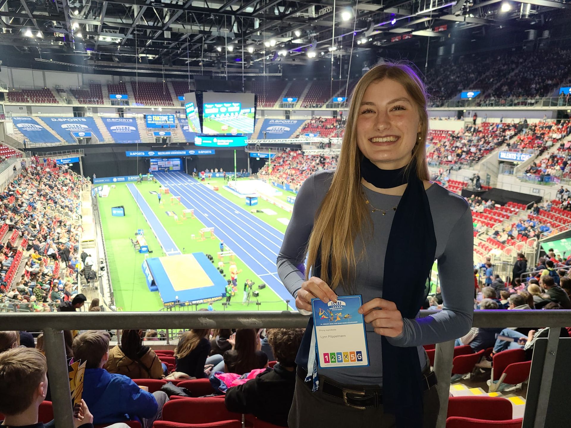 24.01./Düsseldorf. Eine besondere Ehrung in ihrem noch jungen Sportlerleben gab es für Lynn Pöppelmann (17 Jahre) am Samstag im Rahmen des Indoors ISTAF in Düsseldorf. 7600 Zuschauer waren in den PSD BANK DOME gekommen, um Leichtathletikstars wie Yemisi Ogunleye (Kugelstoßren), Malaika Mihambo (Weitsprung), den Briten Jeremiah Azu, den Paralympioniken Jonnie Peacock (zweimaliger Paralympics-Sieger), den Hürden-Triumphator Enrique Llopis (Spanien) oder den niederländischen Überflieger im Stabhochsprung Menno Vloon zu sehen. Und vor dieser Kulisse ehrte der Landesverband in diesem Jahr sehr angemessen seine besten Nachwuchssportlerinnen und Sportler. Mittendrin ... oder besser gesagt "ganz oben" stand mit Lynn Pöppelmann eine Athletin des TuS Köln rrh. Bereits im letzte Jahr hatte Lynn die Ehrung als beste U18-Athletin 2024 entgegennehmen dürfen. Diesen Erfolg konnte sie in 2025 wiederholen - mit noch stärkeren Leistungen. Überlegen hatte sie in ihrer Disziplin 400m-Hürden die U18-DM gewonnen. Überlegen führt sie auch die deutsche U18-Bestenliste 2025 an. Bei den europäischen Jugendspielen in Skopje wurde sie Fünfte. Ihre Zeit von 59,22 sec ist die elftbeste Zeit in der Welt in ihrer Altersklasse und die Elftschnellste Zeit, die in Deutschland jemals von einer U18 Athletin erzielt wurde. Gleich die ersten sechs Zeiten gehen auf das Konto von DDR-Athletinnen in den 80iger Jahren, die unter einer ganz anderen Kombination von Schule und Sport trainieren konnten als das heute in der deutschen Leichtathletik möglich ist. Der LVN hat ganz sicher eine würdige Athletin ausgewählt. Wir gratulieren Lynn und ihrem Trainer Dieter Dylong ganz herzlich und freuen uns mit über diese besondere Auszeichnung!