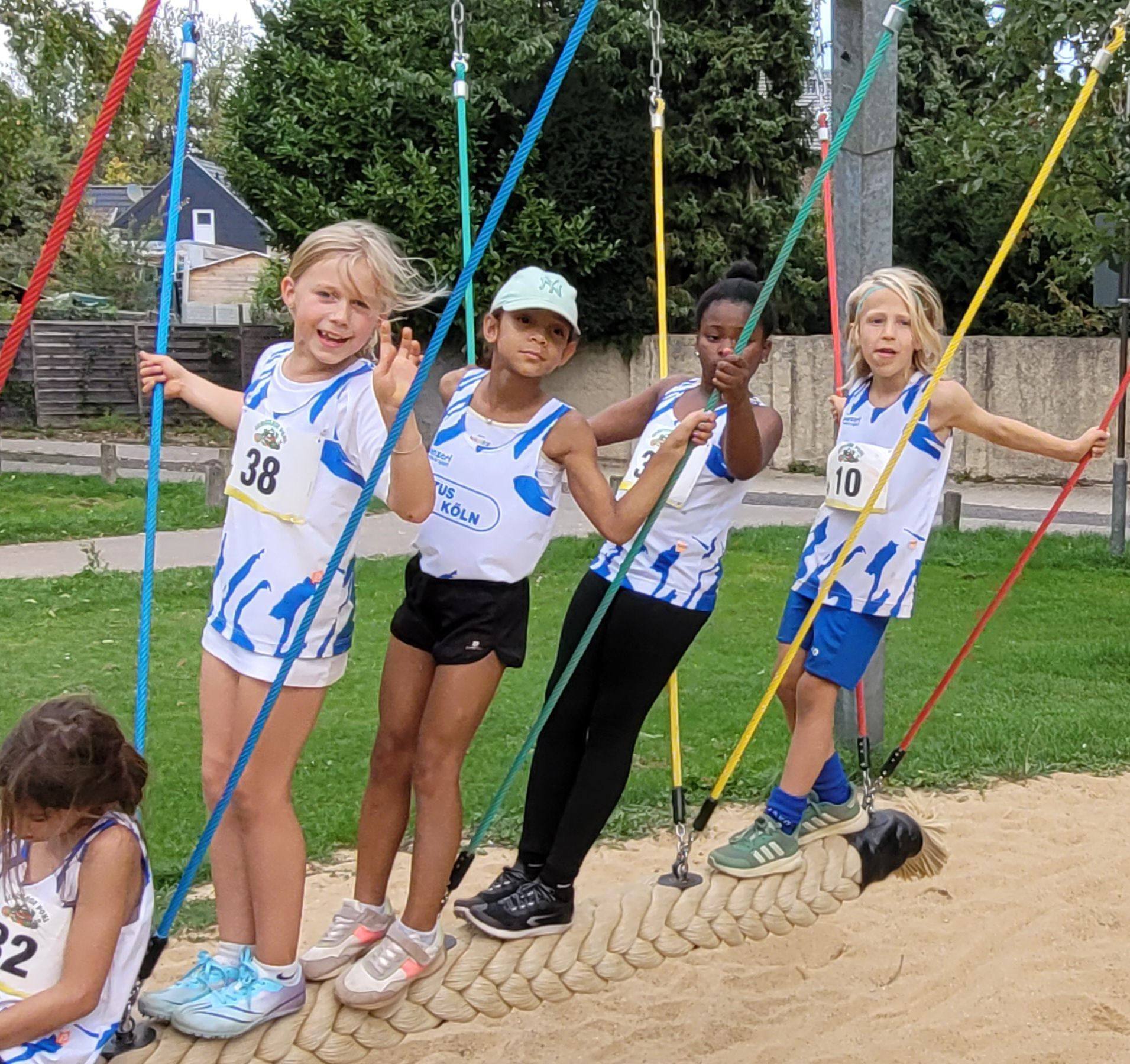 Bei der fünften Ausgabe stellte unsere U10 mit 18 Athletinnen und Athleten nicht nur ein großes sondern auch ein sehr erfolgreiches Team. Derin Akgün und Thomas Weyres konnten den Vierkampf aus Weitsprung, Ballwurf, Bananenkistenrennen und 40m-Sprint in ihren Altersklassen W8 (Mädchen, 8 Jahre) und M8 (Jungen, 8 Jahre) gewinnen. Auch Jaro Schulze (3. Platz, M8) und Miika Koecher (2. Platz, M9) schafften den Sprung aufs Siegerpodest. Und Romy Krahn (W8) und Anni Kathagen (W9) standen direkt daneben auf Platz 4. Wieviel Sportspaß bei unseren Jüngsten im Spiel ist, zeigt sich aber nicht in Weiten und Zeiten, sondern an ihrer Bewegungsfreude. In jeder freien Minute zwischen den einzelnen Wettkampfdisziplinen waren sie auf dem Klettergerüst oder auf der Riesenschaukel unterwegs oder schlugen Rad und probierten Handstand. Hanna Schlapper hatte morgens schon an den Bundesjugendspielen ihrer Schule teilgenommen und Thomas Weyres und Jaro Schulze ein Fußballspiel absolviert. Ganz schön viel Energie, die in unseren jüngsten Athletinnen und Athleten steckt!